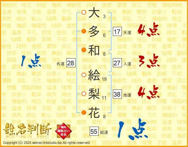 大(3画)多(6画)和(8画) 絵(19画)梨(11画)花(8画)