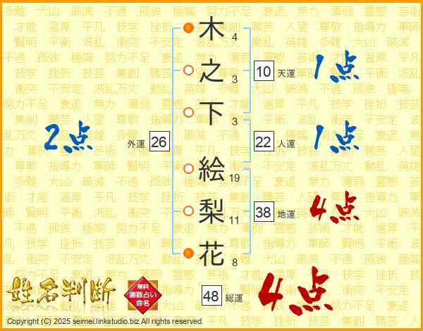 木(4画)之(3画)下(3画) 絵(19画)梨(11画)花(8画)