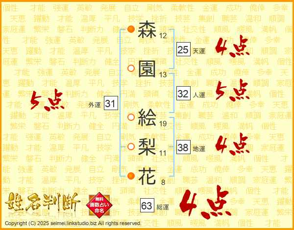 森(12画)園(13画) 絵(19画)梨(11画)花(8画)