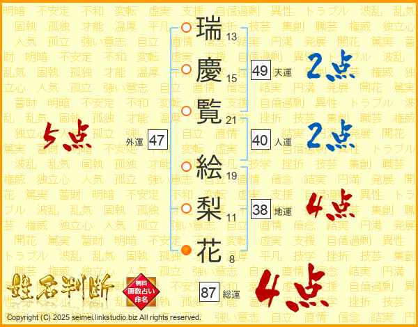 瑞(13画)慶(15画)覧(21画) 絵(19画)梨(11画)花(8画)