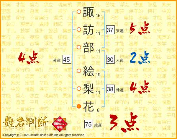 諏(15画)訪(11画)部(11画) 絵(19画)梨(11画)花(8画)