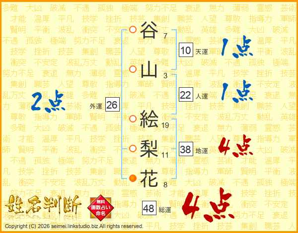 谷(7画)山(3画) 絵(19画)梨(11画)花(8画)