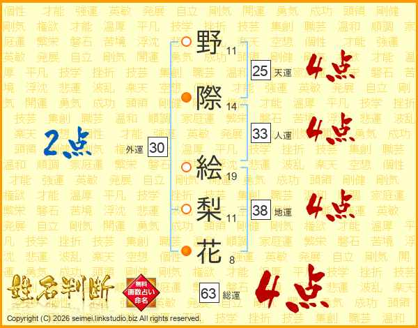 野(11画)際(14画) 絵(19画)梨(11画)花(8画)