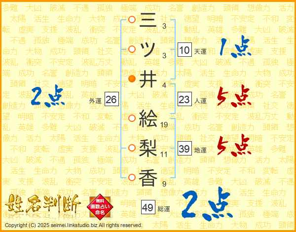 三(3画)ツ(3画)井(4画) 絵(19画)梨(11画)香(9画)