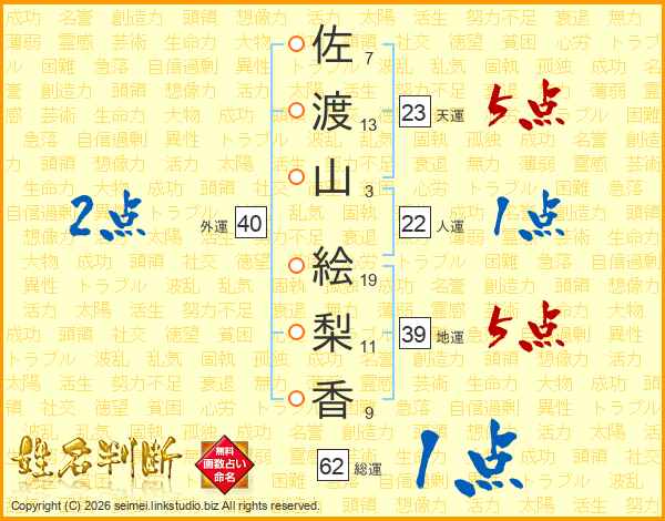 佐(7画)渡(13画)山(3画) 絵(19画)梨(11画)香(9画)
