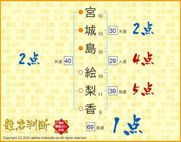 宮(10画)城(10画)島(10画) 絵(19画)梨(11画)香(9画)