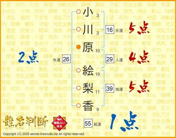 小(3画)川(3画)原(10画) 絵(19画)梨(11画)香(9画)