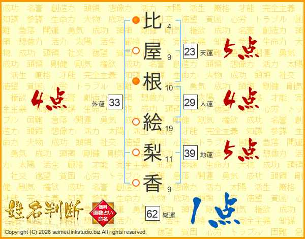 比(4画)屋(9画)根(10画) 絵(19画)梨(11画)香(9画)
