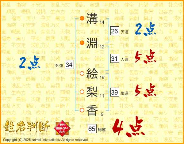 溝(14画)淵(12画) 絵(19画)梨(11画)香(9画)