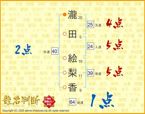 瀧(20画)田(5画) 絵(19画)梨(11画)香(9画)