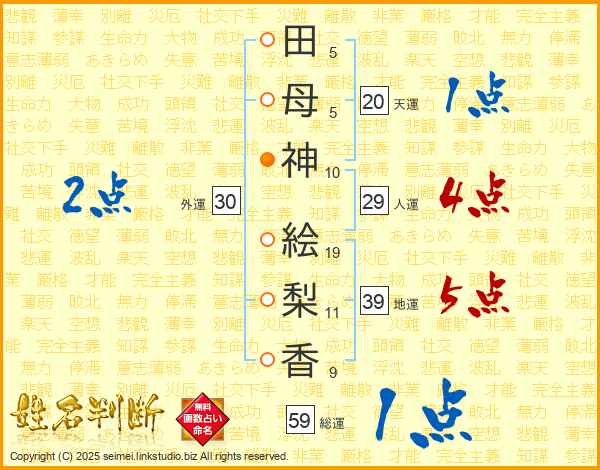 田(5画)母(5画)神(10画) 絵(19画)梨(11画)香(9画)