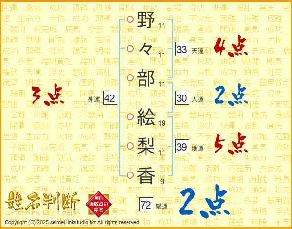 野(11画)々(11画)部(11画) 絵(19画)梨(11画)香(9画)