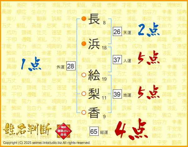 長(8画)浜(18画) 絵(19画)梨(11画)香(9画)