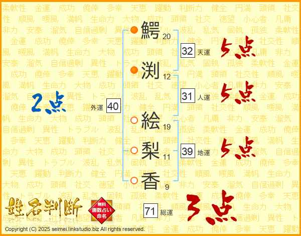 鰐(20画)渕(12画)  絵(19画)梨(11画)香(9画)