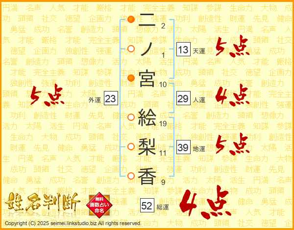 二(2画)ノ(1画)宮(10画) 絵(19画)梨(11画)香(9画)