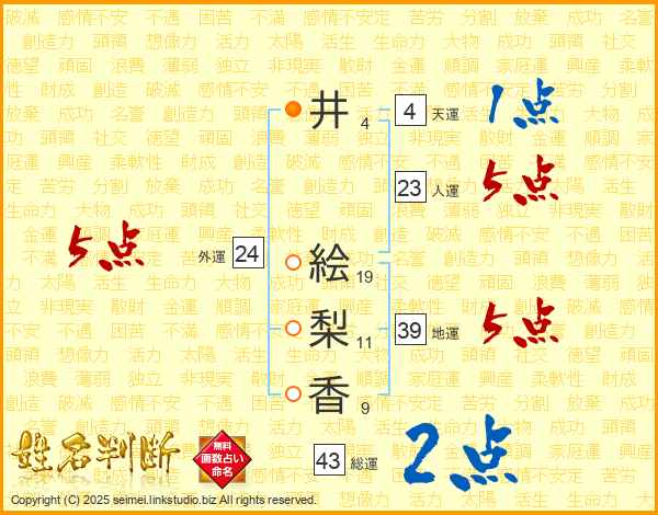 井(4画) 絵(19画)梨(11画)香(9画)