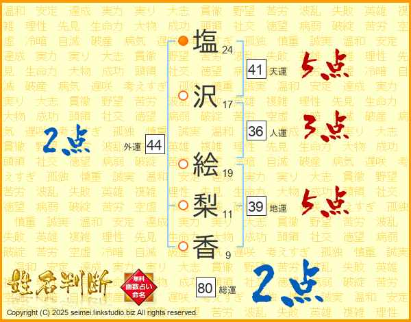 塩(24画)沢(17画) 絵(19画)梨(11画)香(9画)