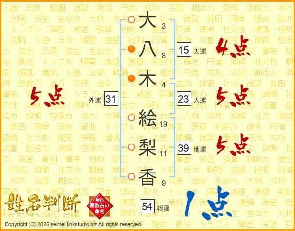 大(3画)八(8画)木(4画) 絵(19画)梨(11画)香(9画)