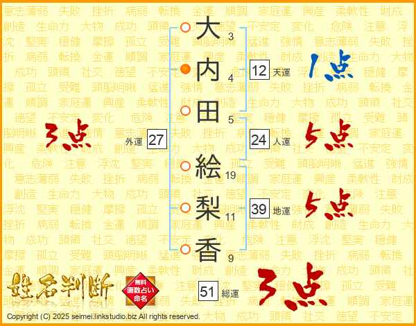 大(3画)内(4画)田(5画) 絵(19画)梨(11画)香(9画)