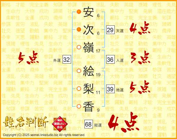 安(6画)次(6画)嶺(17画) 絵(19画)梨(11画)香(9画)