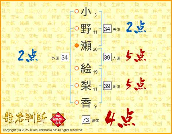 小(3画)野(11画)瀬(20画)  絵(19画)梨(11画)香(9画)