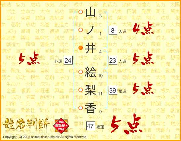 山(3画)ノ(1画)井(4画) 絵(19画)梨(11画)香(9画)