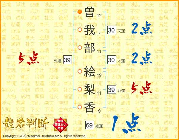 曽(12画)我(7画)部(11画) 絵(19画)梨(11画)香(9画)