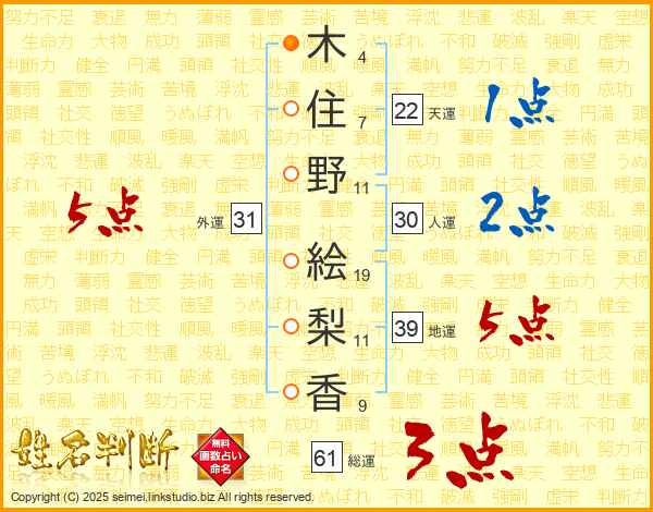 木(4画)住(7画)野(11画) 絵(19画)梨(11画)香(9画)