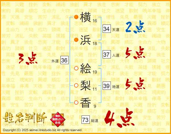 横(16画)浜(18画) 絵(19画)梨(11画)香(9画)