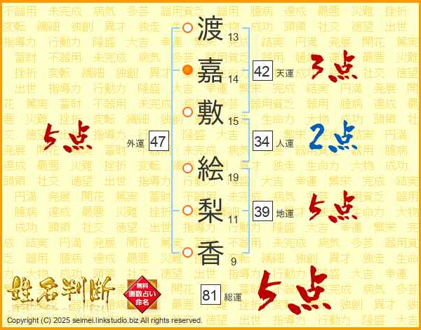 渡(13画)嘉(14画)敷(15画)  絵(19画)梨(11画)香(9画)