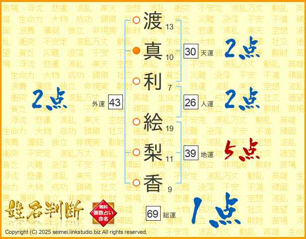 渡(13画)真(10画)利(7画) 絵(19画)梨(11画)香(9画)