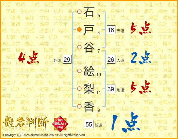 石(5画)戸(4画)谷(7画) 絵(19画)梨(11画)香(9画)