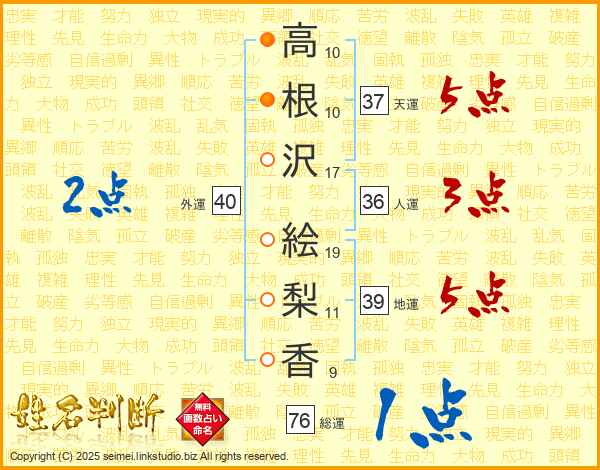 高(10画)根(10画)沢(17画) 絵(19画)梨(11画)香(9画)