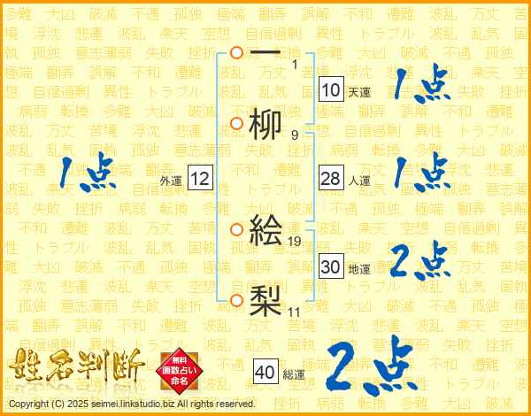 一(1画)柳(9画) 絵(19画)梨(11画)