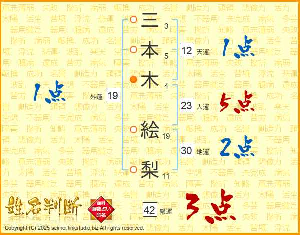 三(3画)本(5画)木(4画) 絵(19画)梨(11画)