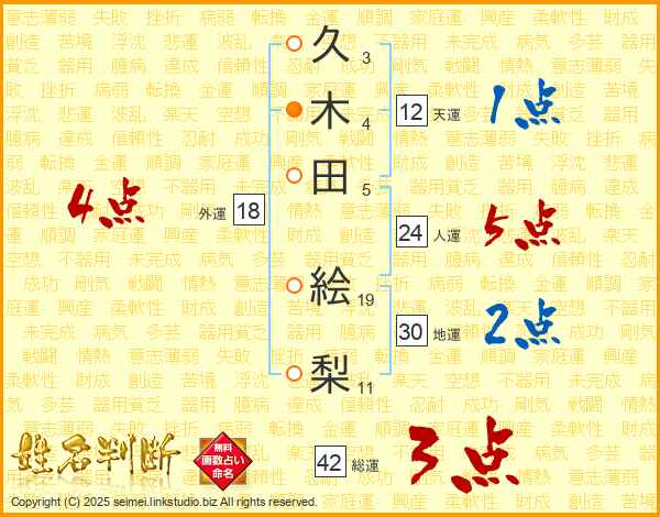 久(3画)木(4画)田(5画) 絵(19画)梨(11画)