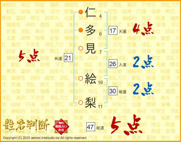仁(4画)多(6画)見(7画) 絵(19画)梨(11画)