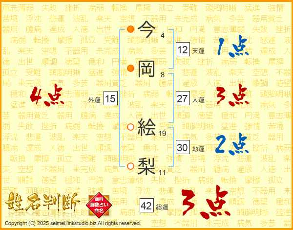 今(4画)岡(8画) 絵(19画)梨(11画)