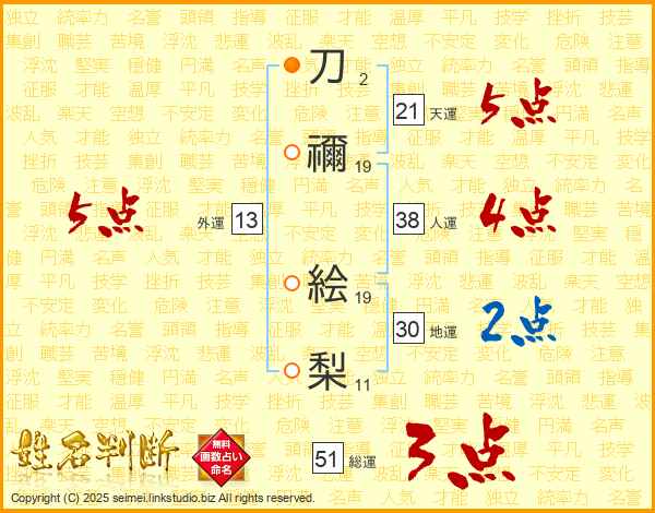 刀(2画)禰(19画) 絵(19画)梨(11画)