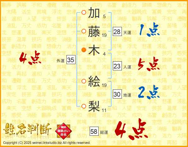 加(5画)藤(19画)木(4画) 絵(19画)梨(11画)