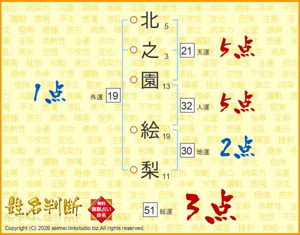 北之園絵梨さんの人運は32画の5点!