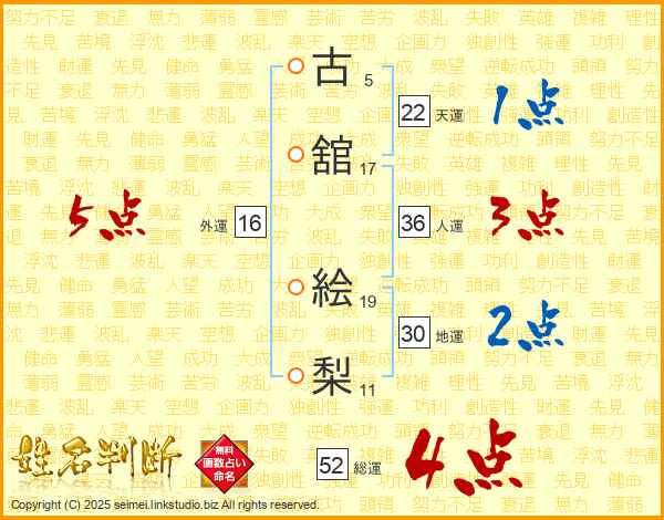 古(5画)舘(17画) 絵(19画)梨(11画)