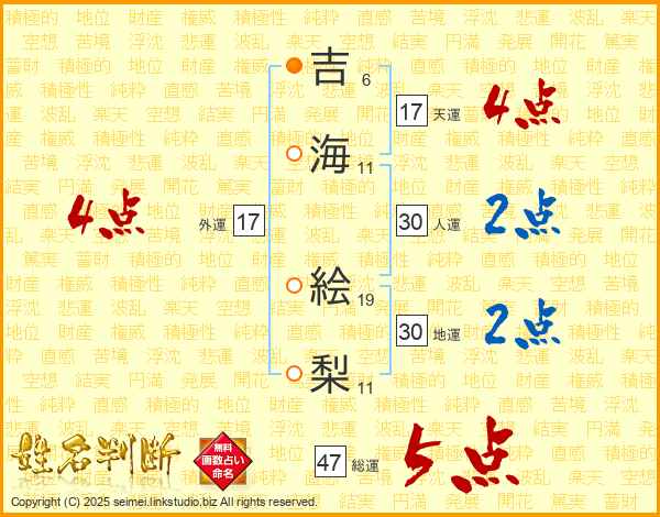 吉(6画)海(11画) 絵(19画)梨(11画)