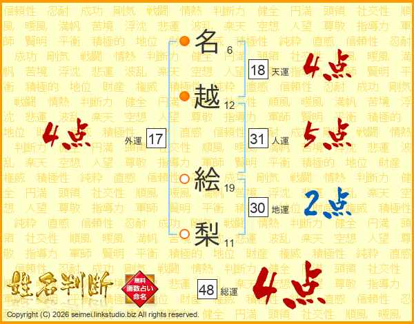 あなたの人生を表す1番重要な運勢です。生涯を通じて影響する総合運となり、主に50歳以降の晩年期に影響を及ぼします。苗字と名前の合計画数。