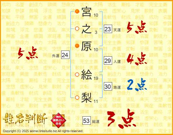 宮(10画)之(3画)原(10画) 絵(19画)梨(11画)
