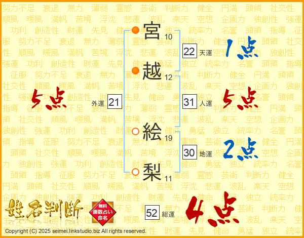 宮(10画)越(12画) 絵(19画)梨(11画)