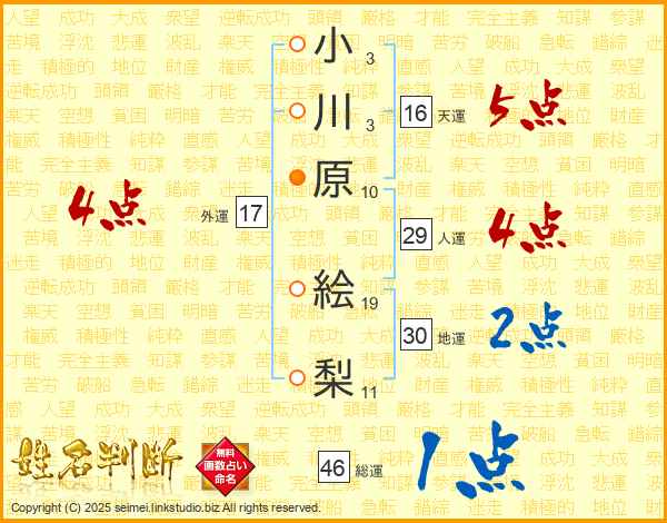 小(3画)川(3画)原(10画) 絵(19画)梨(11画)