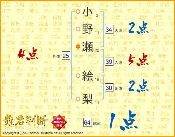 小(3画)野(11画)瀬(20画) 絵(19画)梨(11画)