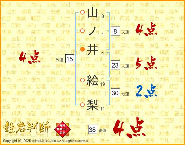 山ノ井絵梨さんの総運は38画の4点!