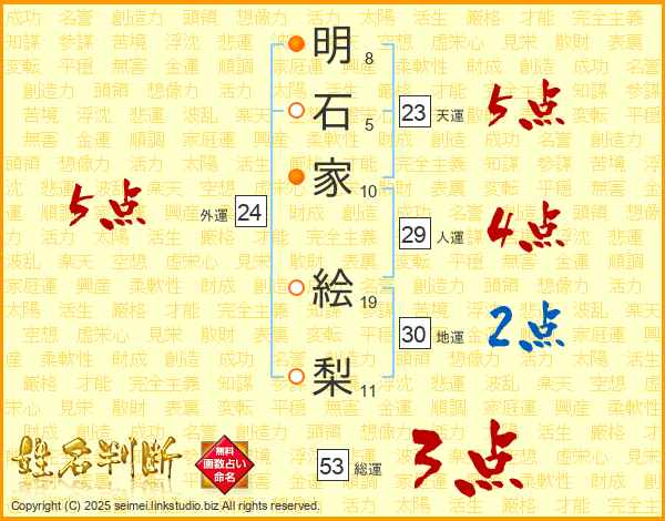 明(8画)石(5画)家(10画) 絵(19画)梨(11画)